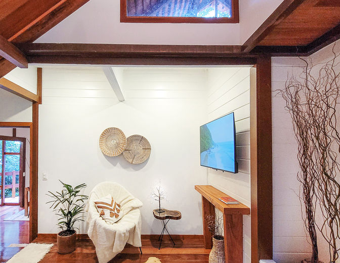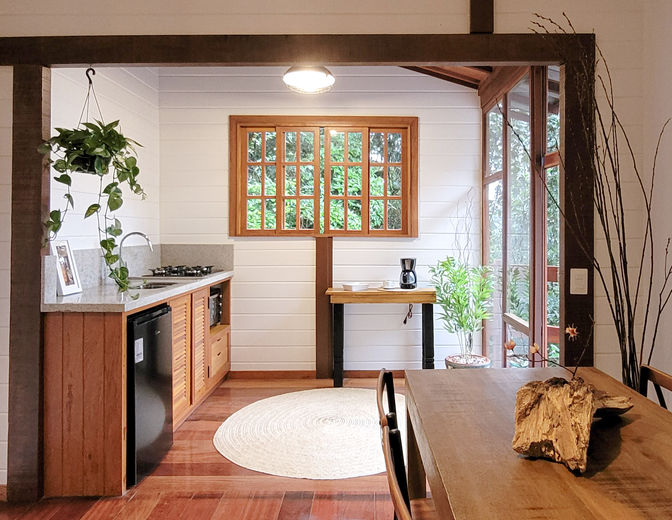 Este lindo e confortável chalé possui hidro com vista para a floresta, lareira, cozinha também com vista agradável para o verde e muito charme. Ideal para casal.